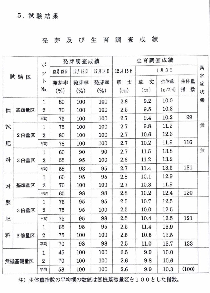 上記の栽培試験の結果、供試肥料区が植物に対して安全であり、肥料として十分に利用可能であることが確認されました。